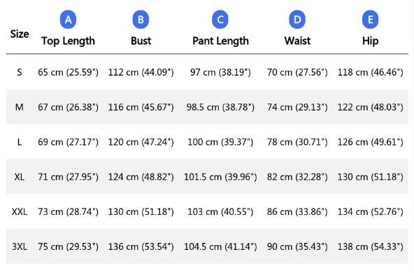 Size XXL: Top Length 73 cm (28.74''), Bust 130 cm (51.18''), Pant Length 103 cm (40.55''), Waist 86 cm (33.86''), Hip 134 cm (52.76'')